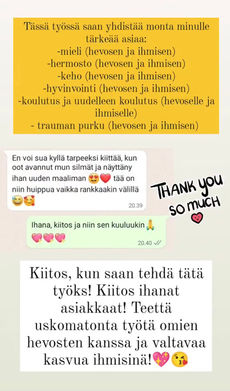 Vastattuasi kyllä, varataan valmennussessio ja jutellaan lisää. Valmennettavakseni pääsee vain ilmaisen valmennussession kautta, sillä haluan varmistaa, että jokainen mukaan lähtijä saa varmasti muutoksen aikaan ja ryhmä täyttyy vain ihmisistä, jotka oikeasti haluavat saavuttaa hevosen kanssa unelmatilanteen.